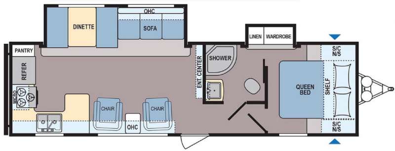As you step inside model 296RK you will find to your left a couple of lounge chairs with an end table between, and overhead storage above that stretches all the way back to the rear wall. Beneath the cabinetry you will find a u-shaped counter with a double sink along the curb side wall. Across the rear wall you will enjoy cooking for your family using the three burner range with overhead microwave oven, a refrigerator, and food pantry for all of your dry and canned goods. Adjacent is a slide out dinette and sofa with cabinetry overhead to keep things neat and tidy when not in use. Both seating areas can be made into sleeping space for overnight guests, and there is also an entertainment center along the interior of the room which is easily viewable from any seating in the space.